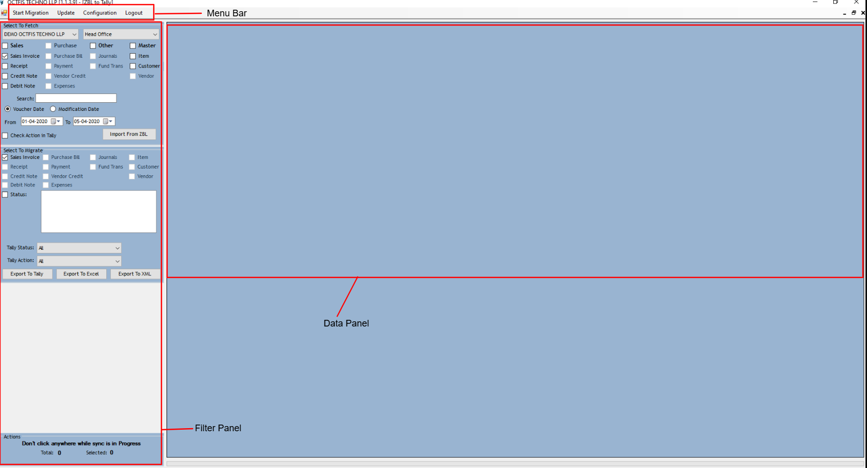 Step – 2 Select all the data from Data Panel that you would like to migrate from ZBL to Tally tool.